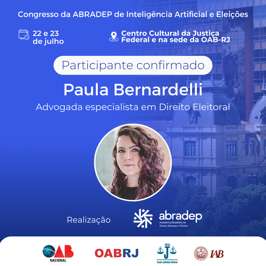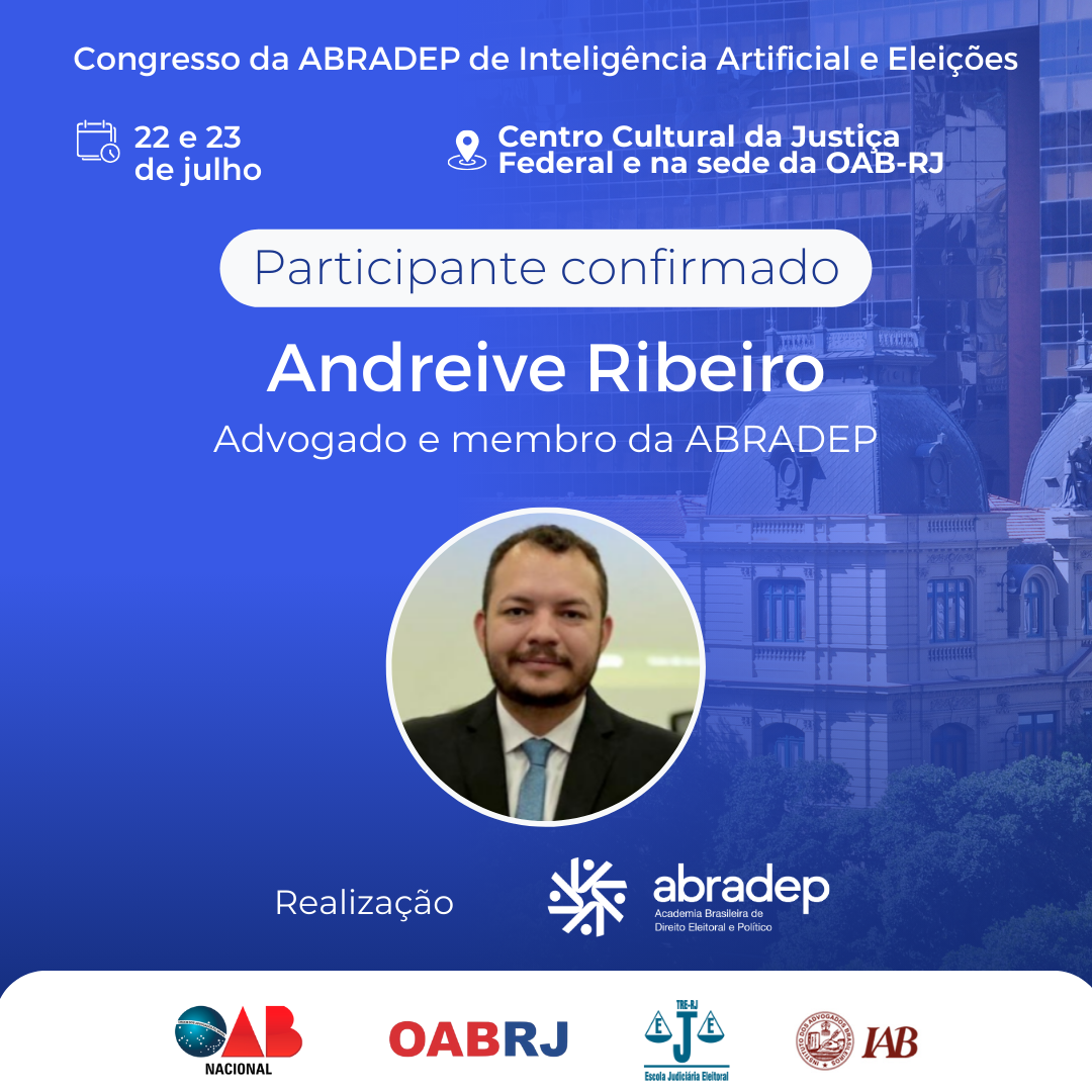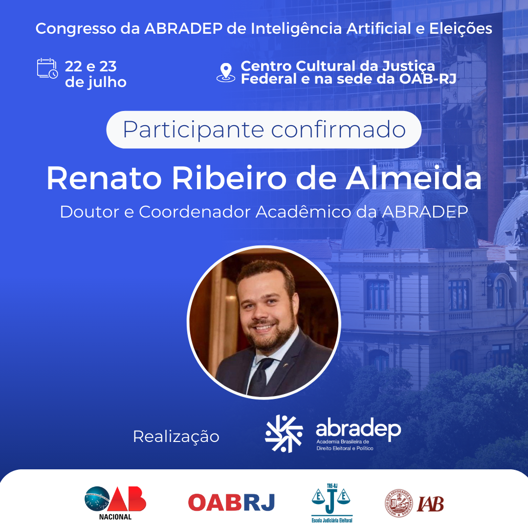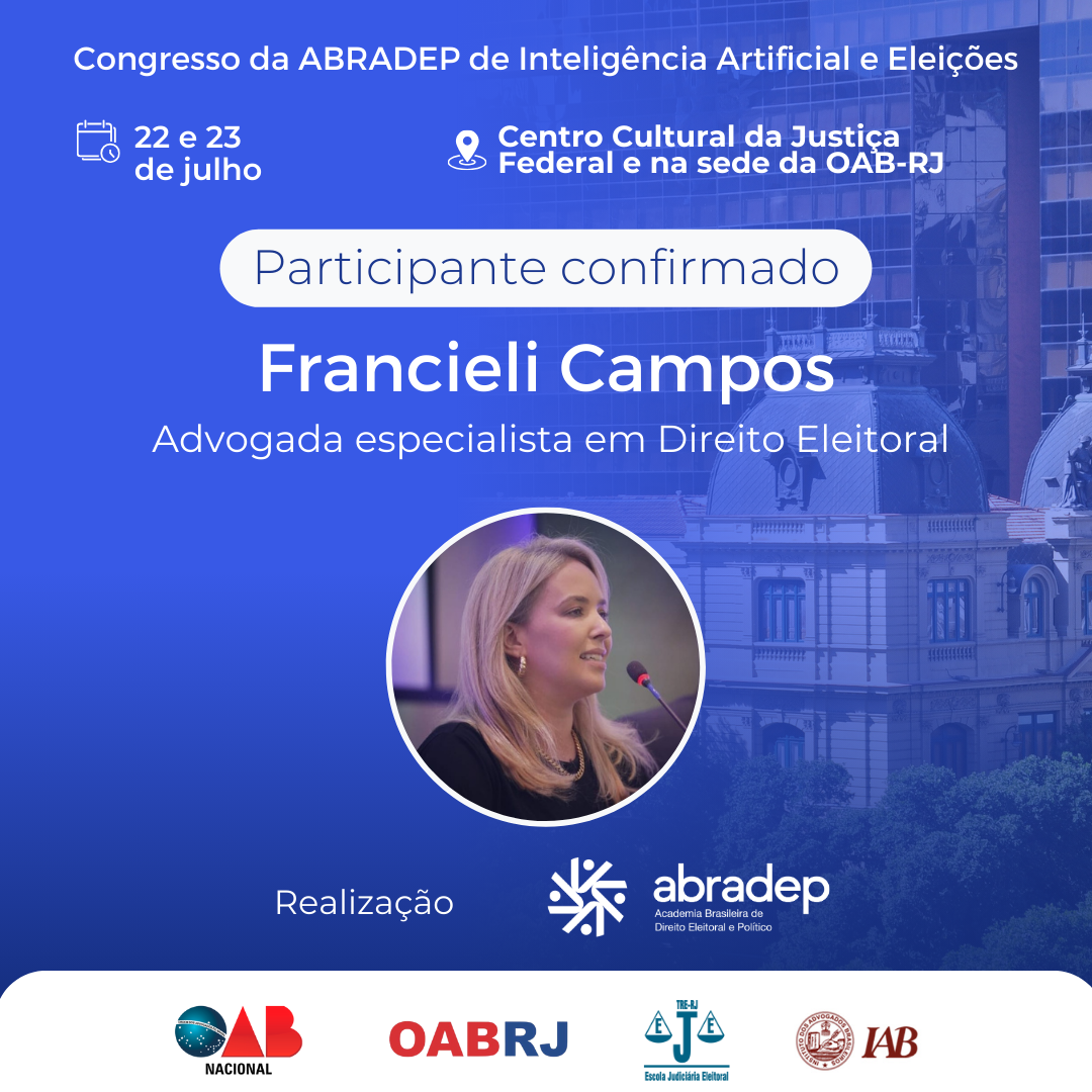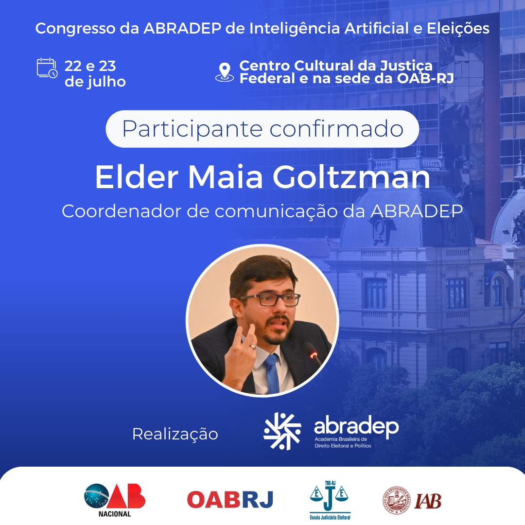 08/04/2024O 1º Congresso da ABRADEP de Inteligência Artificial e Eleições acontecerá nos dias 22 e 23 de julho, no Centro Cultural da Justiça Federal, no Rio de Janeiro, e na sede da OAB Rio de Janeiro. O evento fará uma homenagem ao Desembargador Fernando Cerqueira Chagas, além de debater os temas mais atuais e pertinentes referentes ao uso responsável da inteligência artificial e demais tecnologias nas eleições, o combate à desinformação e a defesa da democracia.