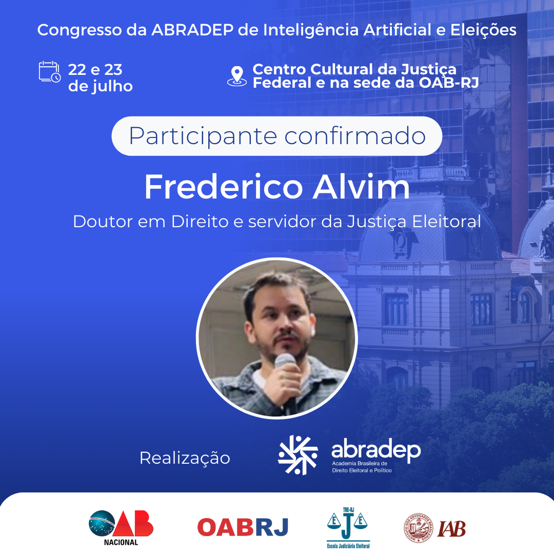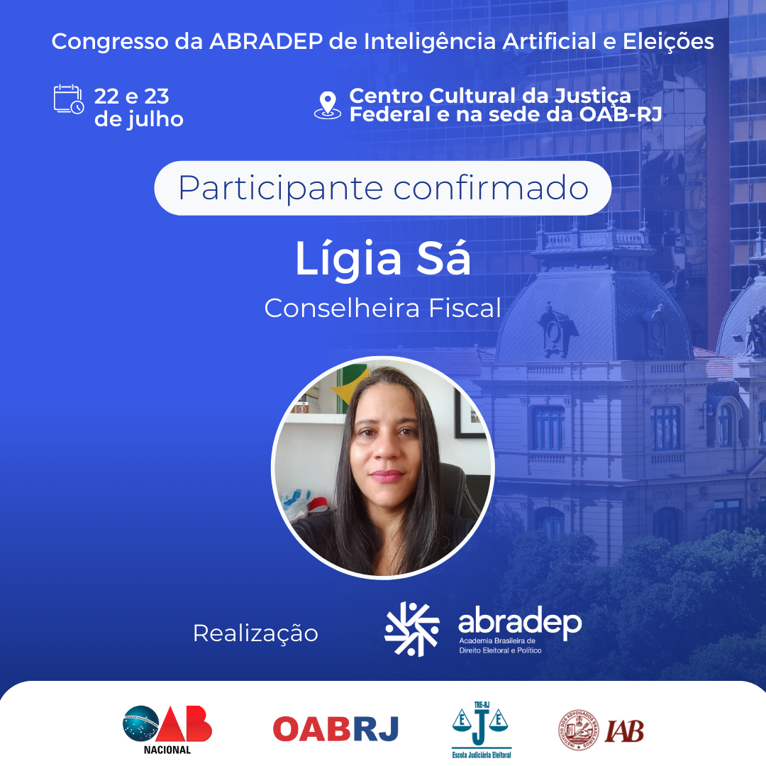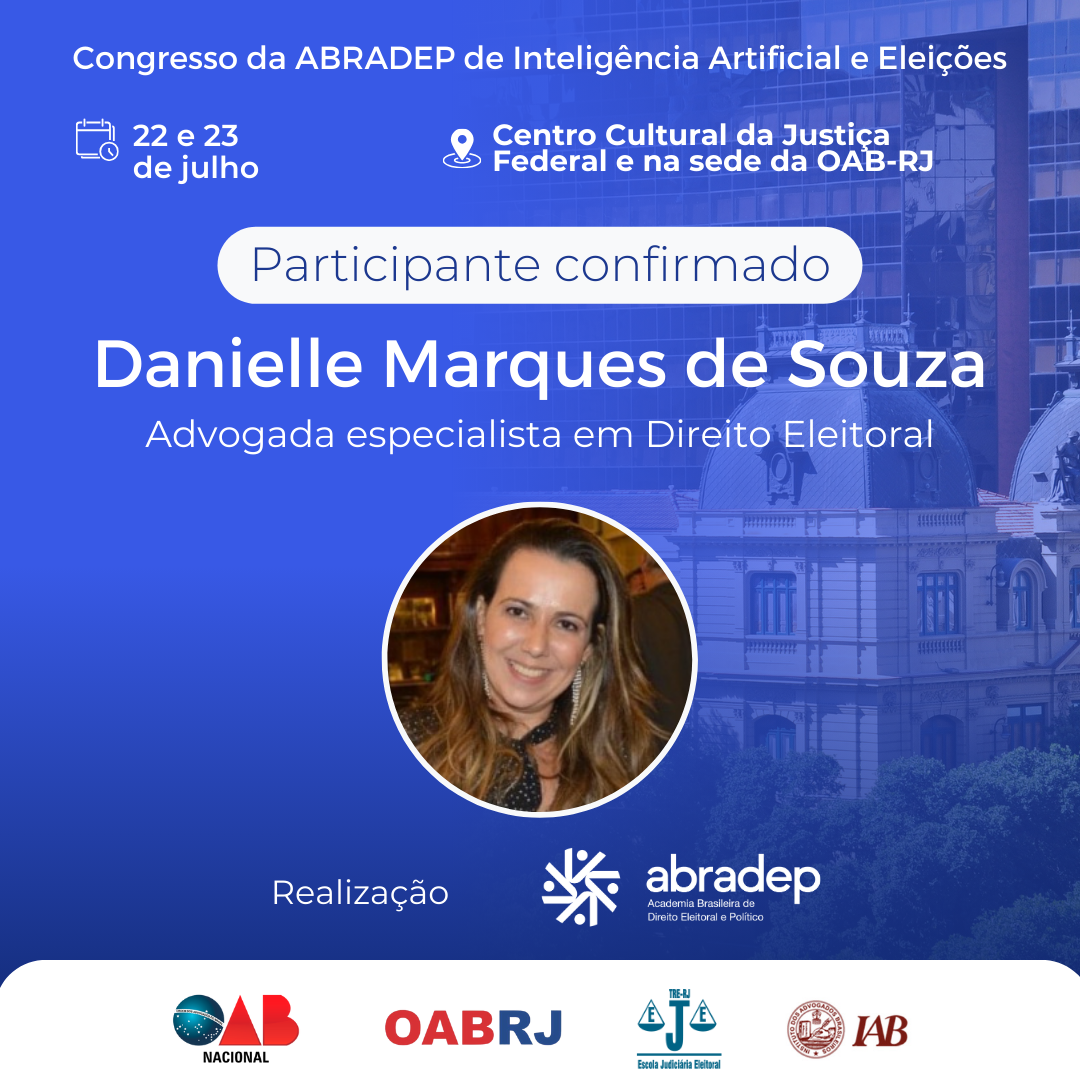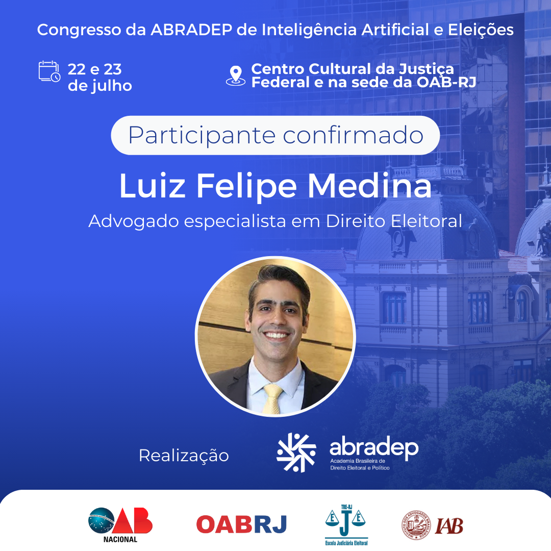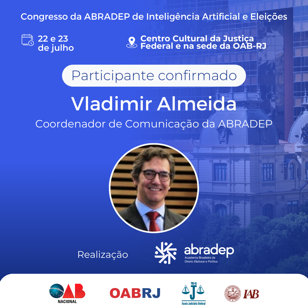 08/04/2024O 1º Congresso da ABRADEP de Inteligência Artificial e Eleições acontecerá nos dias 22 e 23 de julho, no Centro Cultural da Justiça Federal, no Rio de Janeiro, e na sede da OAB Rio de Janeiro. O evento fará uma homenagem ao Desembargador Fernando Cerqueira Chagas, além de debater os temas mais atuais e pertinentes referentes ao uso responsável da inteligência artificial e demais tecnologias nas eleições, o combate à desinformação e a defesa da democracia.