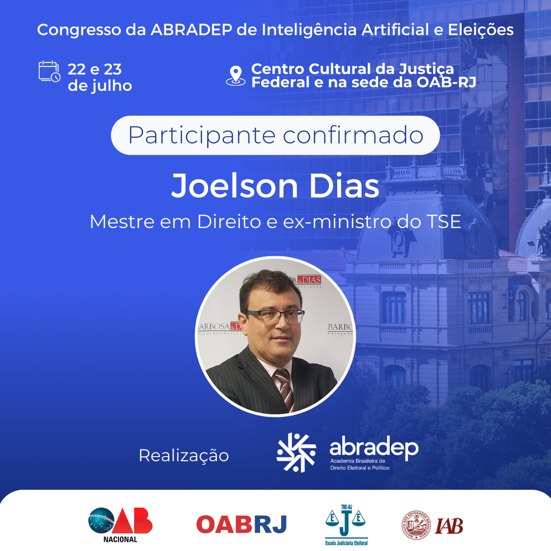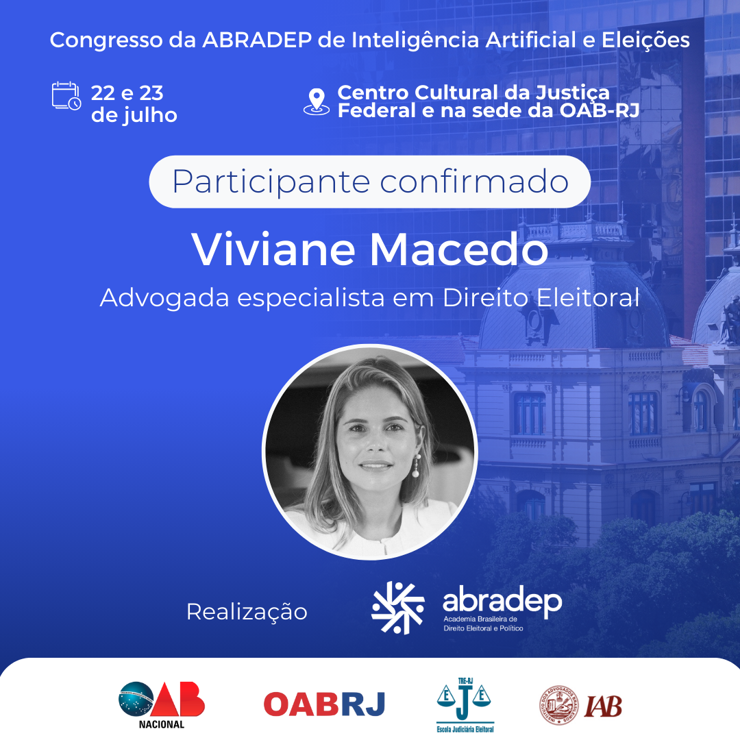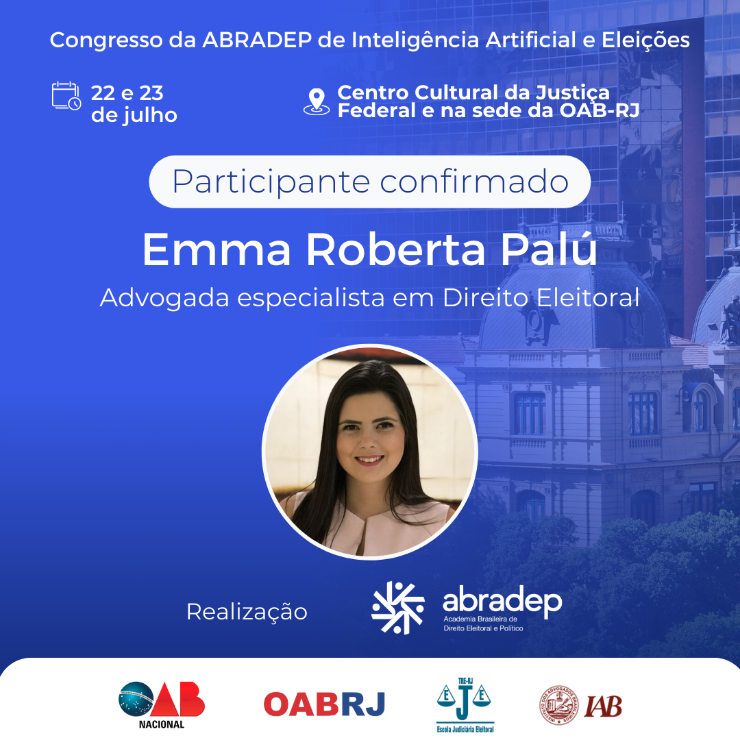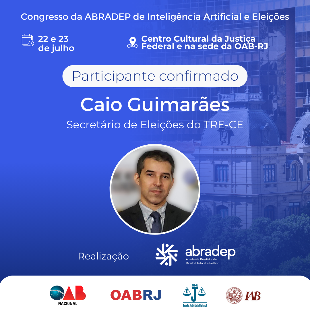 08/04/2024O 1º Congresso da ABRADEP de Inteligência Artificial e Eleições acontecerá nos dias 22 e 23 de julho, no Centro Cultural da Justiça Federal, no Rio de Janeiro, e na sede da OAB Rio de Janeiro. O evento fará uma homenagem ao Desembargador Fernando Cerqueira Chagas, além de debater os temas mais atuais e pertinentes referentes ao uso responsável da inteligência artificial e demais tecnologias nas eleições, o combate à desinformação e a defesa da democracia.