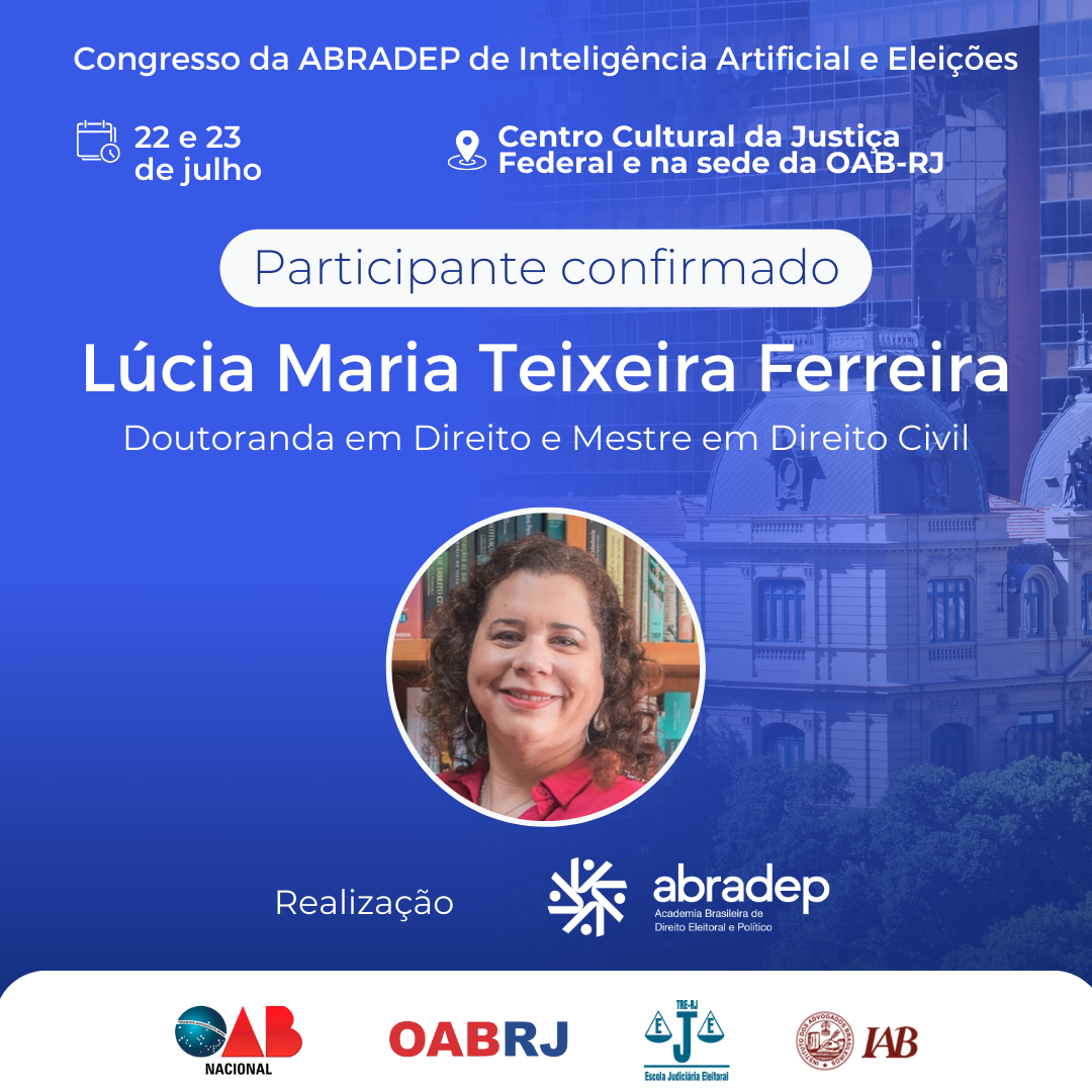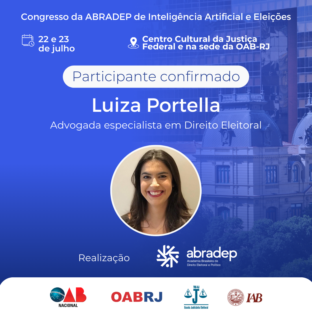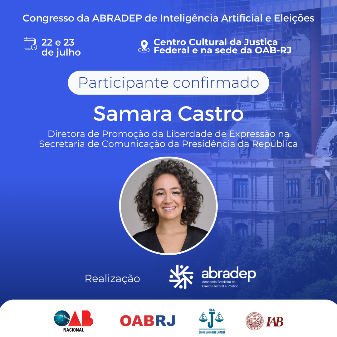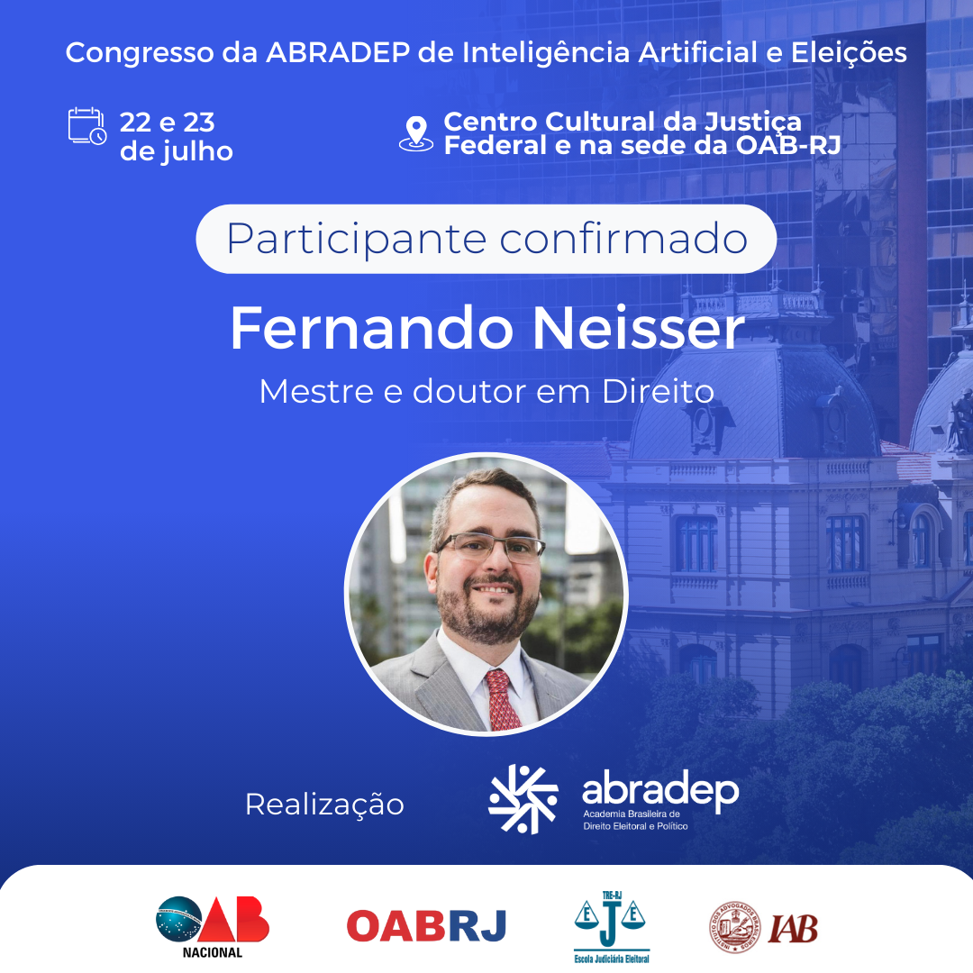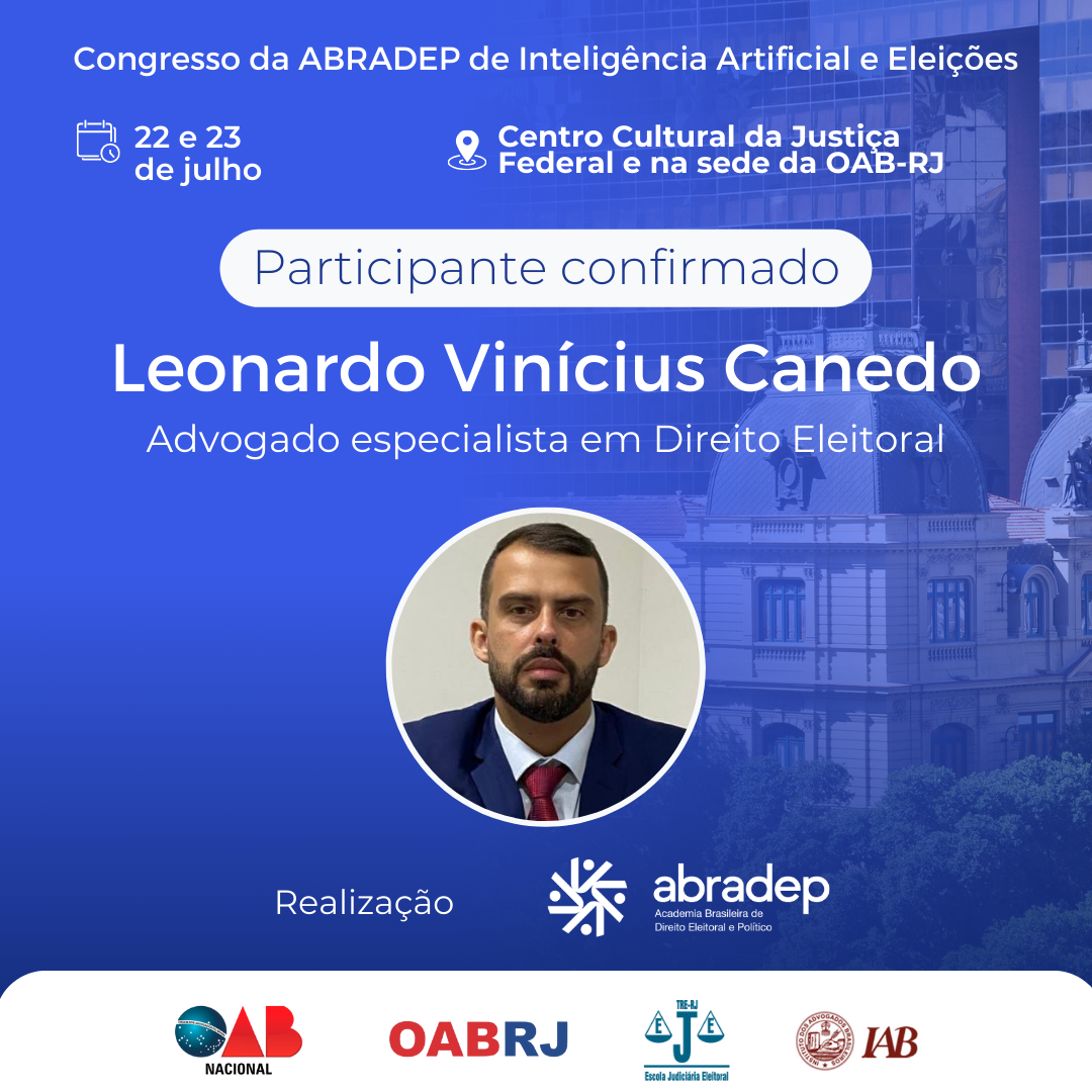 08/04/2024O 1º Congresso da ABRADEP de Inteligência Artificial e Eleições acontecerá nos dias 22 e 23 de julho, no Centro Cultural da Justiça Federal, no Rio de Janeiro, e na sede da OAB Rio de Janeiro. O evento fará uma homenagem ao Desembargador Fernando Cerqueira Chagas, além de debater os temas mais atuais e pertinentes referentes ao uso responsável da inteligência artificial e demais tecnologias nas eleições, o combate à desinformação e a defesa da democracia.